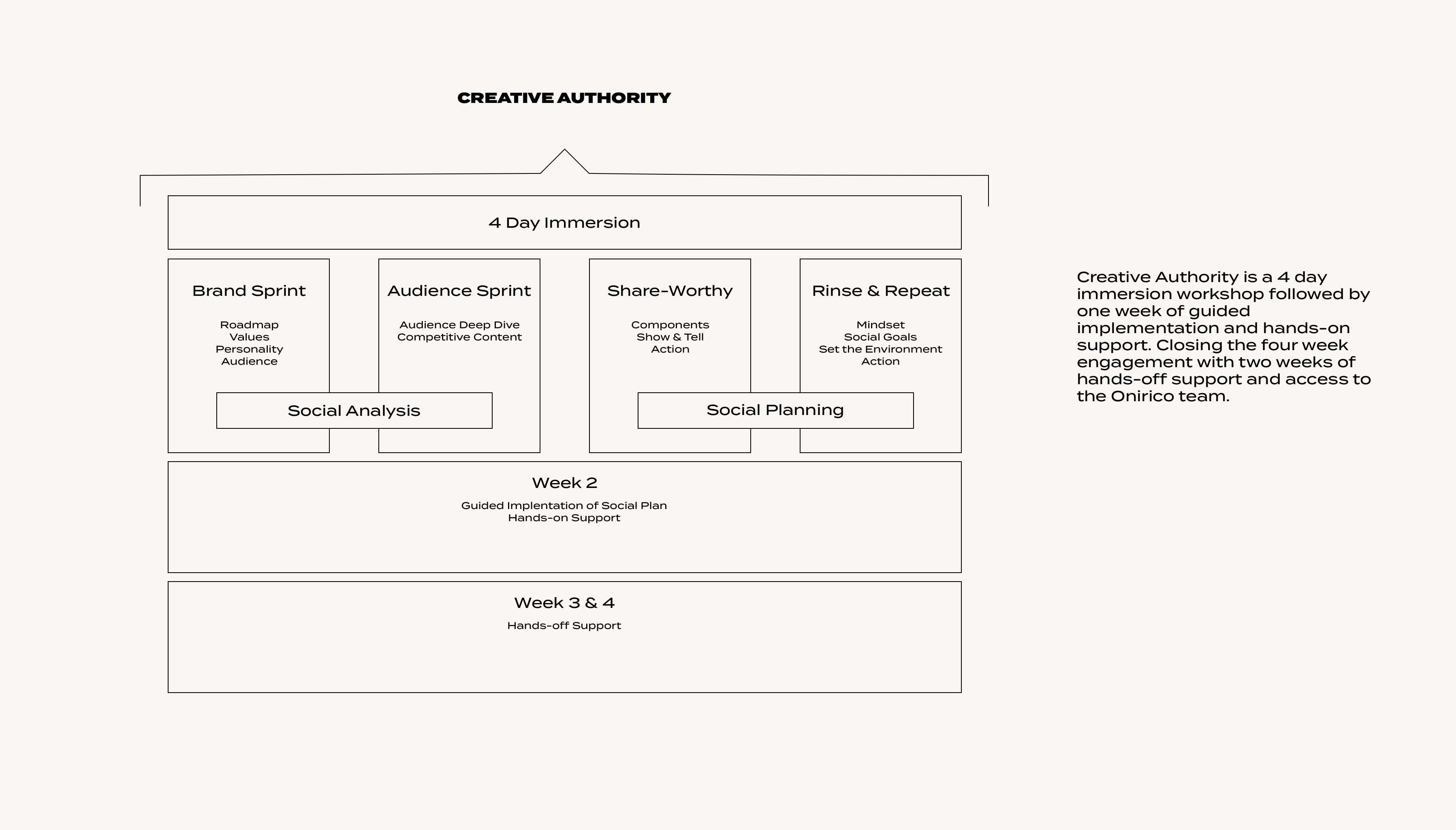 The process consists of a four day workshop immersion. Each day we will present a different workshop with stakeholders designed to build your Creative Authority. The workshops in this four day immersion are: